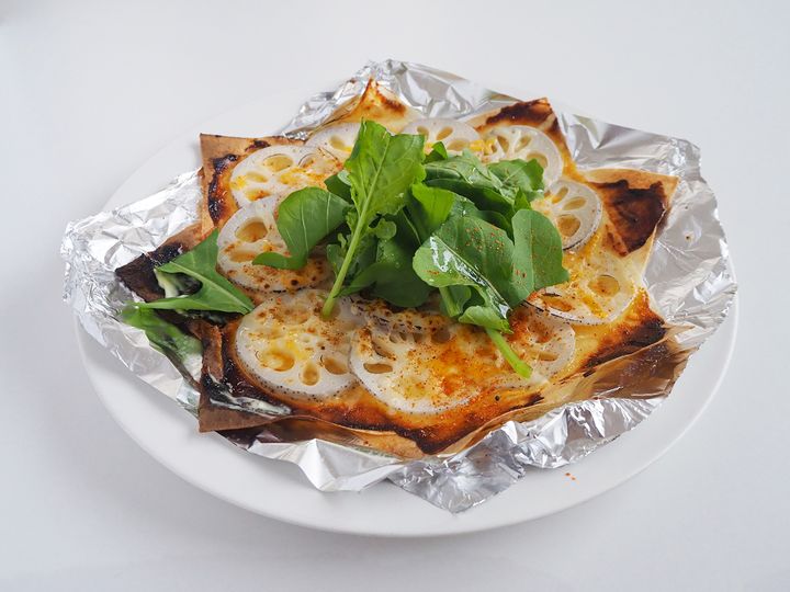 4. こんがり焼き目がつくまでトースター(1000W)で5分程度焼く。仕上げにルッコラ 、オリーブオイル、七味唐辛子をトッピングする。