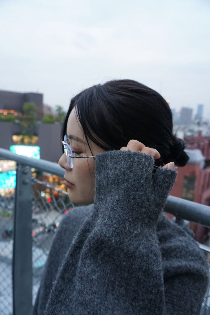 「杢(もく)調のカラーリングが魅力的なジゼルフのニットは、ウール混の糸を使用していて温かく、冬の防寒性もバッチリで今季重宝しています。チャコールグレーのトラウザーと、ワントーンにまとめてモードな印象に」