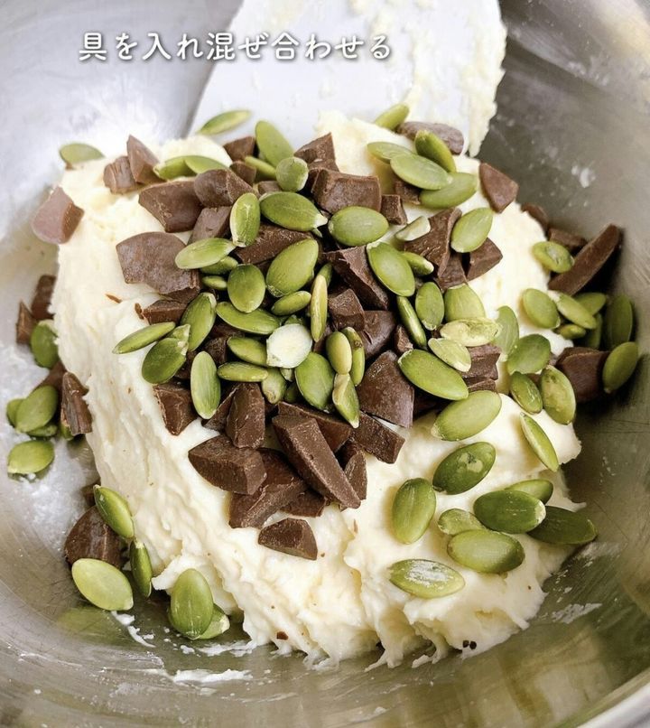 2.チョコレートとカボチャの種子を入れ、混ぜ合わせます。