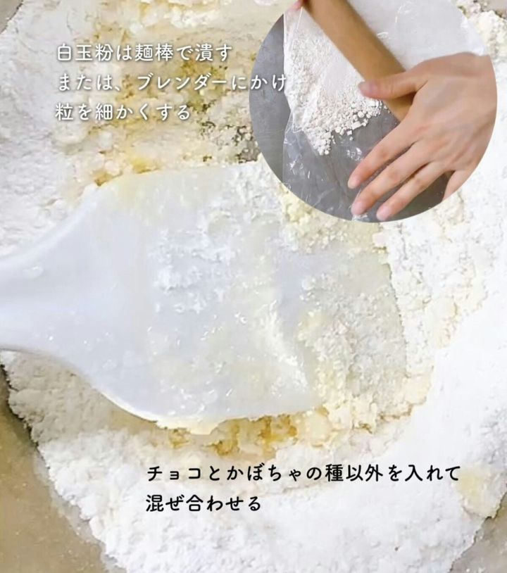 1.白玉粉はめん棒でつぶします(または、ブレンダーにかけて粒を細かくします)。チョコレートとカボチャの種以外を入れ、混ぜ合わせます。