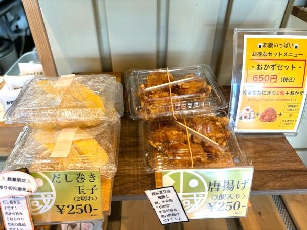 お得な「おかずセット」は好きなおにぎり2個とだし巻き玉子か唐揚げどちらか一つを選んで650円です!(スパムは一つにつきプラス100円) だし巻き玉子も唐揚げもおいしいと評判です。おにぎりとの相性も抜群ですよね。 国道43号線沿いで近くに神戸製鋼があるので通勤客も多く、「明日の分も」と予約購入される常連さんもいらっしゃるそうですよ♪