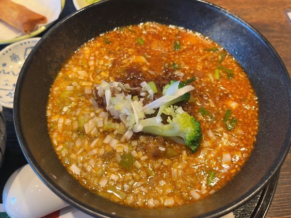 坦々麺セット(1200円)サラダ、ごはんの他、春巻きOR唐揚げが選べます。 今回は春巻きをチョイスしました。