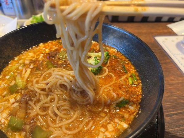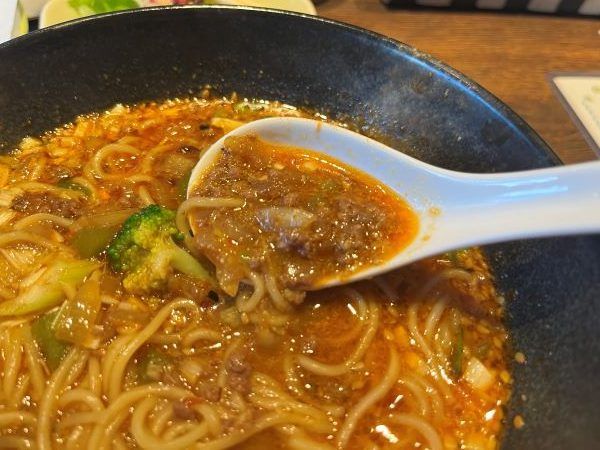 旨辛スープは胡麻の香りがしっかり、やさしいピリ辛。旨い!!!