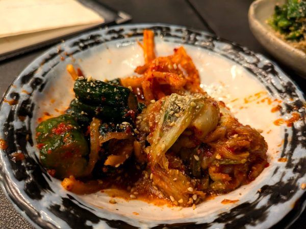 李おばちゃんの特製キムチの盛り合わせ 880円 やっぱ、キムチの盛り合わせでしょう!白菜・キュウリのキムチにもう1つがわからないですね。ボリボリしておいしいです。