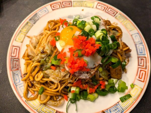 豚焼きそば 968円 豚肉と目玉焼きと焼きそばに紅生姜に青ネギ!おいしい組み合わせです!麺は腰があって、ツルっとした喉越しと弾ける食感がたまりません!