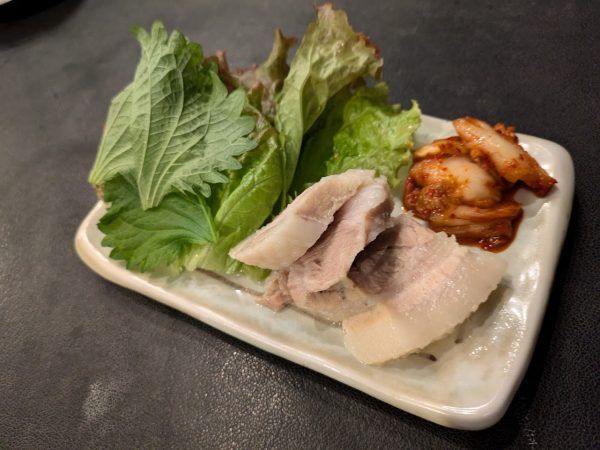 自家製蒸し豚 (2枚)616円 分厚い蒸し豚をレタスと青シソを重ねて、蒸し豚にチョジャン(韓国酢味噌)を絡めて、キムチを乗せて食べます。これはめちゃめちゃおいしいです!