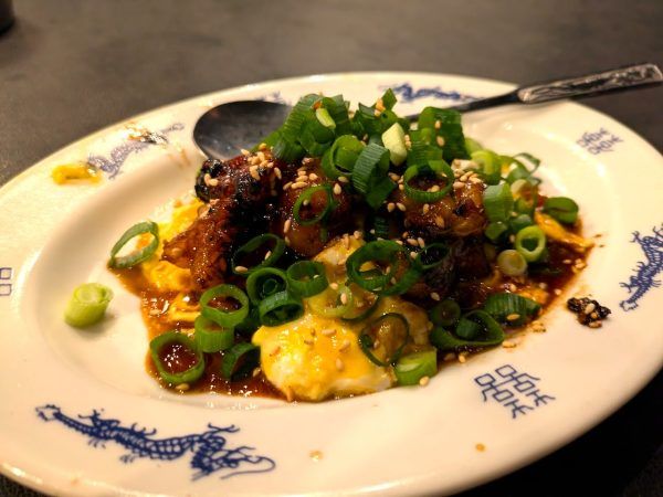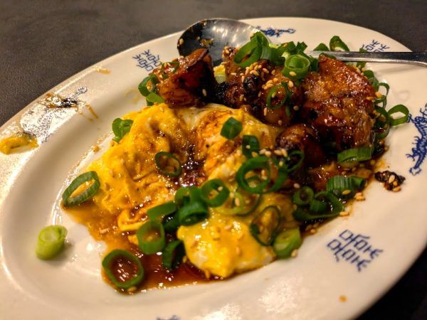 お皿に敷き詰めたふわふわ卵の上にはトロトロホルモン焼き!最高です。