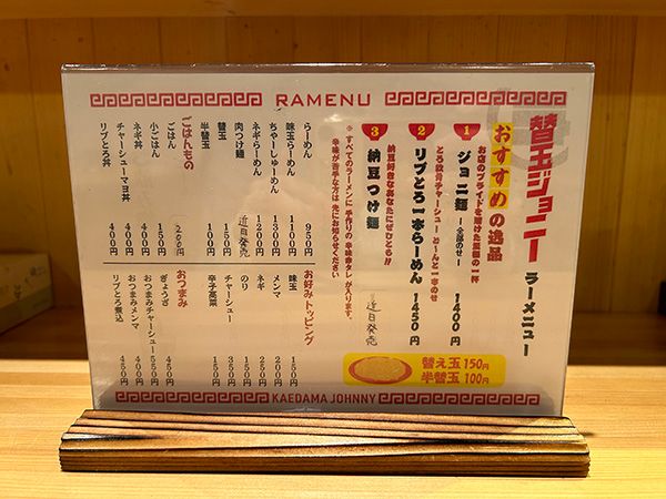 全部のせなんて今までやったことがありませんが、初めて行くラーメン屋さんでは一番人気(券売機では左上、メニューでは右)のメニューを食べるというポリシーがありますので、恐る恐る1,400円の「ジョニ麺」を頼んでみます。
