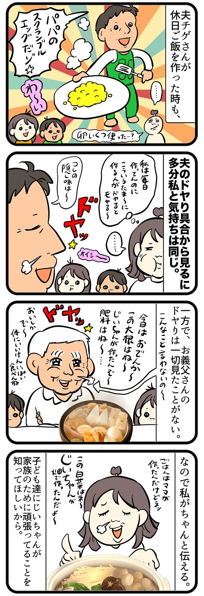褒められたい気持ちは同じなはず。義父・マキオさんの作った野菜が食卓に上がったとき、子どもたちに伝えること【しぶしぶ同居したら義父が最高だった件・59】