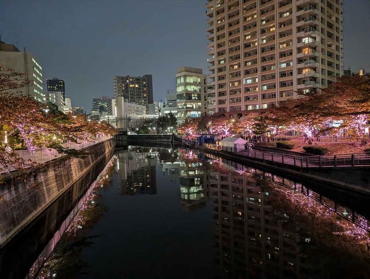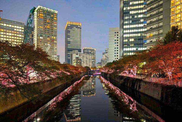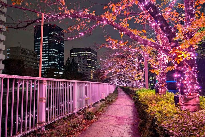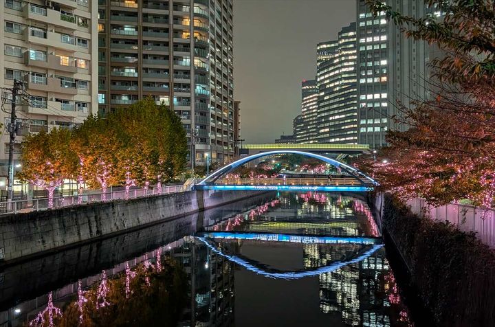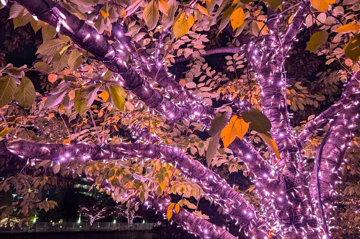 都内屈指の桜の名所である目黒川では、2024年11月15日(金)からイルミネーションイベント「目黒川みんなのイルミネーション2024」を開催しています。春には満開の花を咲かせる桜並木に、約35万球のイルミネーションが光輝く光景は、まるで冬に咲く桜のようで絶景の一言です。
