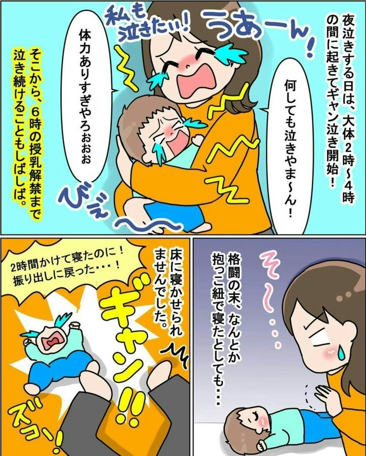 こんなに楽なの?と思っていた矢先、ゆいくんの生活リズムが急に変わります。生後4か月を過ぎたころから、夜泣きが頻繁になり始めます。そして、夜泣きが連日続くようになり、えなりさんは寝不足の日々が始まるのでした…。