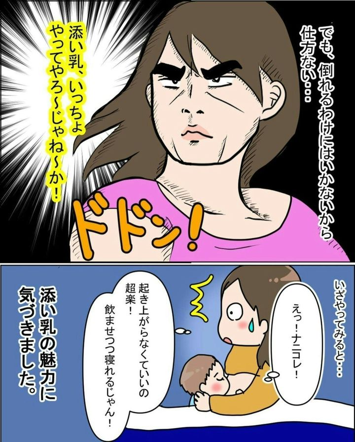 睡眠不足が続き体調不良になってしまったえなりさん。このままでは「自分が倒れてしまう」と危険を感じ、添い乳に挑戦することにします。