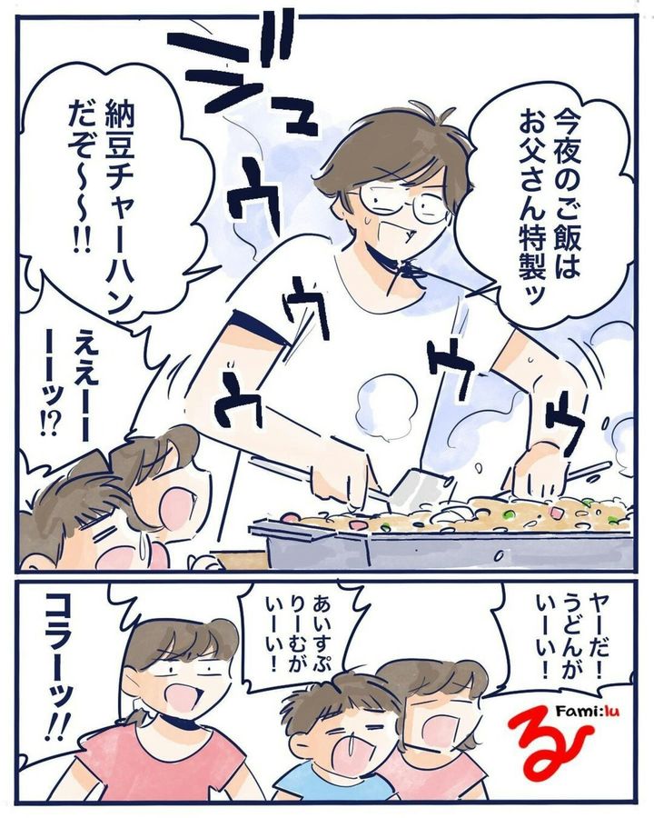 4児の父であるグッドスリープ(@good.sleep7416)さん。妻と長女が不在のある日、特製納豆チャーハンを作ることに。子どもたちの成長を感じつつ、張り切って作ったチャーハンを食卓に出しますが、子どもたちの反応は予想に反したものだったようです。父と子どもたちのテンションの差にクスっとなる作品をお読みください。