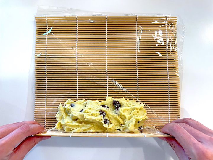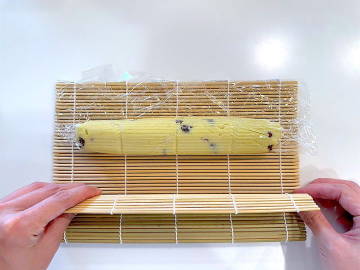 5. 巻きすにラップを敷き、4をそれぞれを巻き、包丁でお好みの厚さに切る。