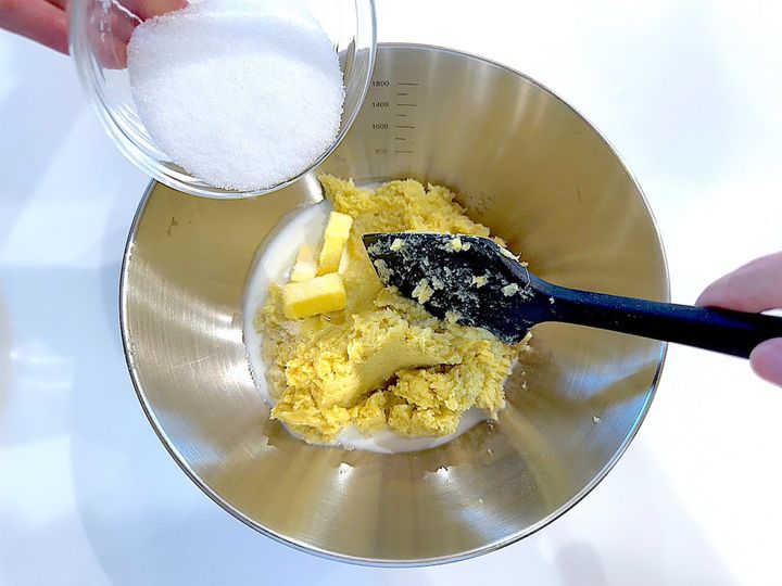 3. 2に砂糖、バター、塩、牛乳を加え、こねる。