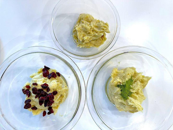 農家さんに教えていただたレシピでは、レーズンと抹茶の2種類でしたが、わが家は子ども用に何も加えない「プレーン」も作りたかったので、生地は3等分にしました。