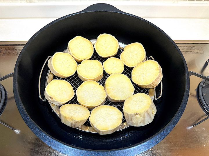 1. さつまいもは皮を剥き、輪切りにして蒸し器で蒸す。