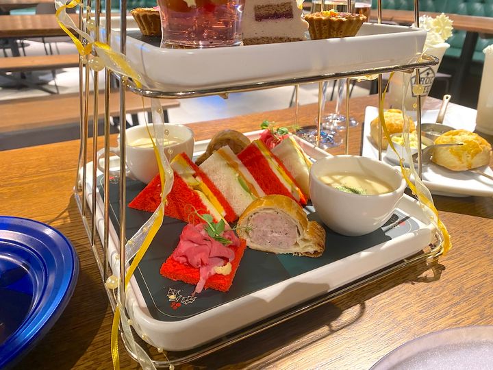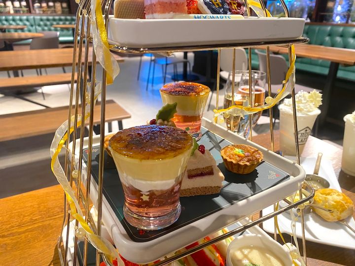 スタジオツアー東京初のクリスマスアフタヌーンティー。3段のスタンドはツリーをイメージしたデザインになっていて、オーナメントやカラフルなデザートで飾りつけされています。