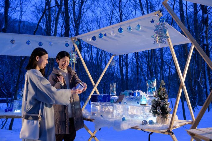 さらに、イベント会場はライトブルーと白を基調とした氷瀑ランタンが灯され、幻想的な雰囲気に包まれます。しんしんと降り積もる雪や木々が美しく照らし出された、非日常感あふれる空間が楽しめますよ。