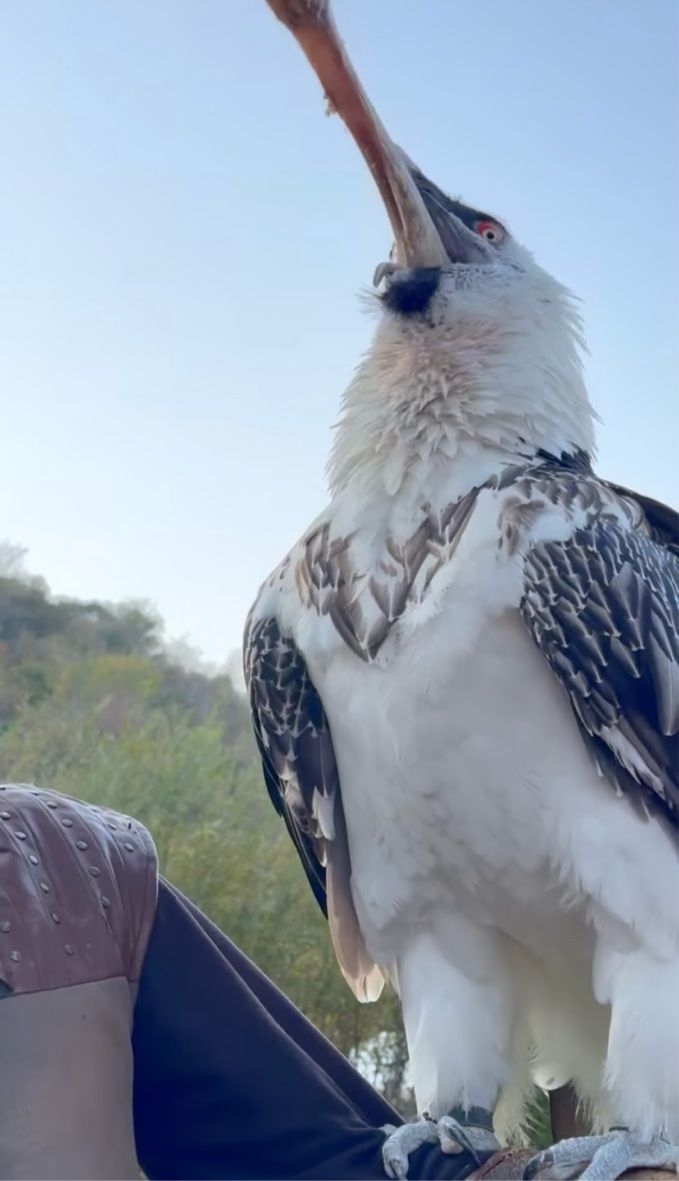 好物の骨を差し出されたヒゲワシ。 とはいえ、さすがに大きすぎるので、いったん飲み込みやすいサイズに砕いたりするのかと思いきや・・・、なんと丸飲みしてしまったのです!!