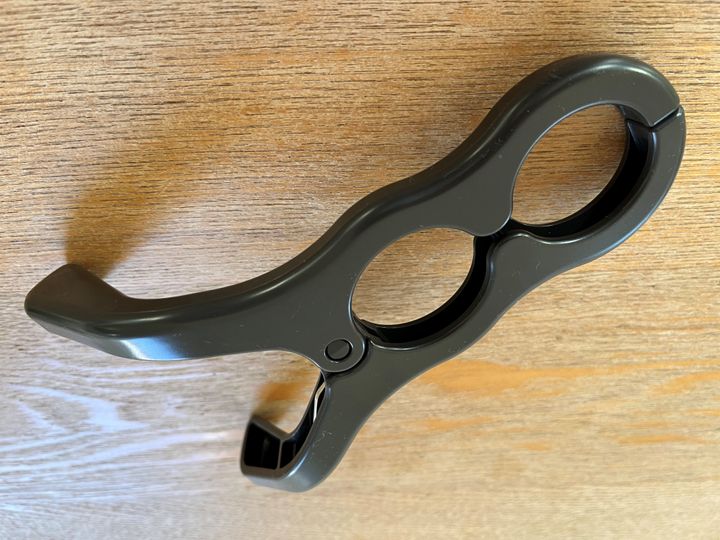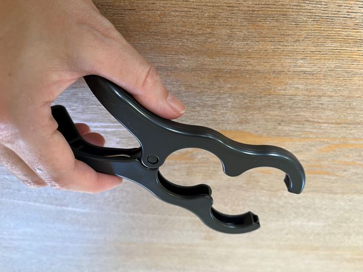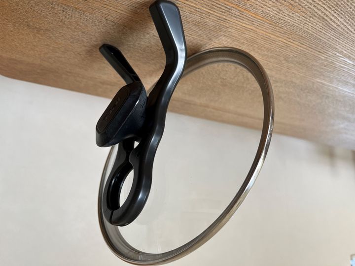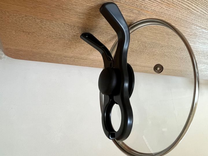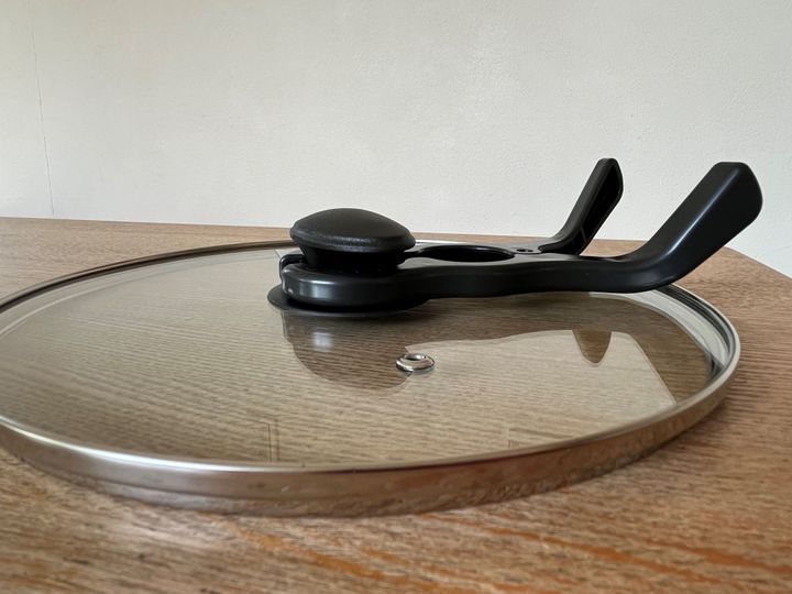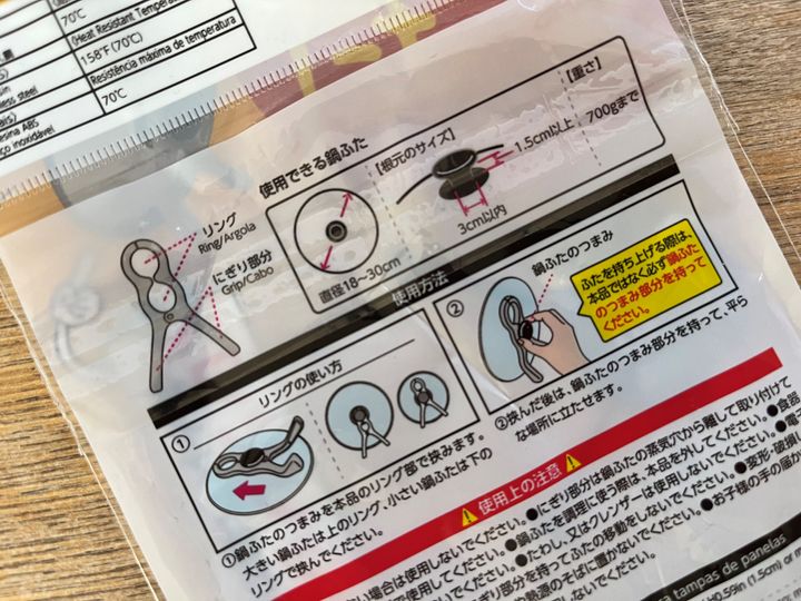 これで鍋ふたのつまみを挟むと、ふたを立てておくことができるというもの。大きめの洗濯バサミみたいな形状です。