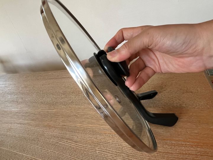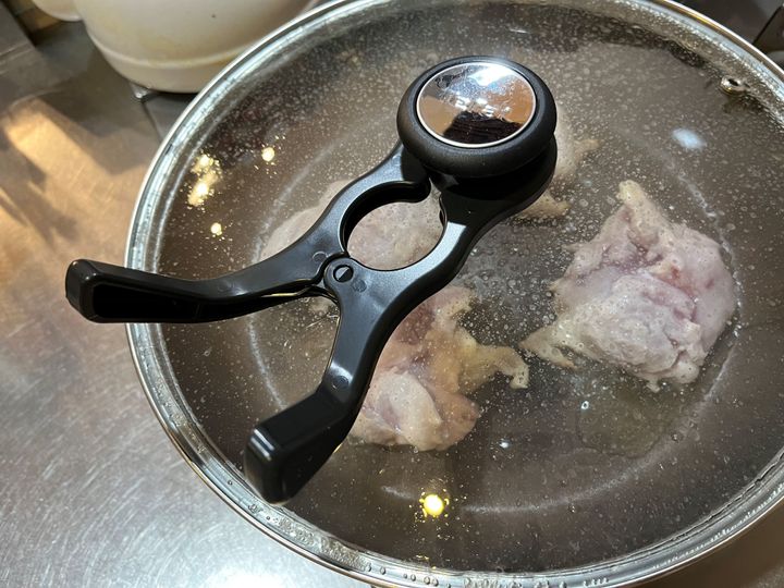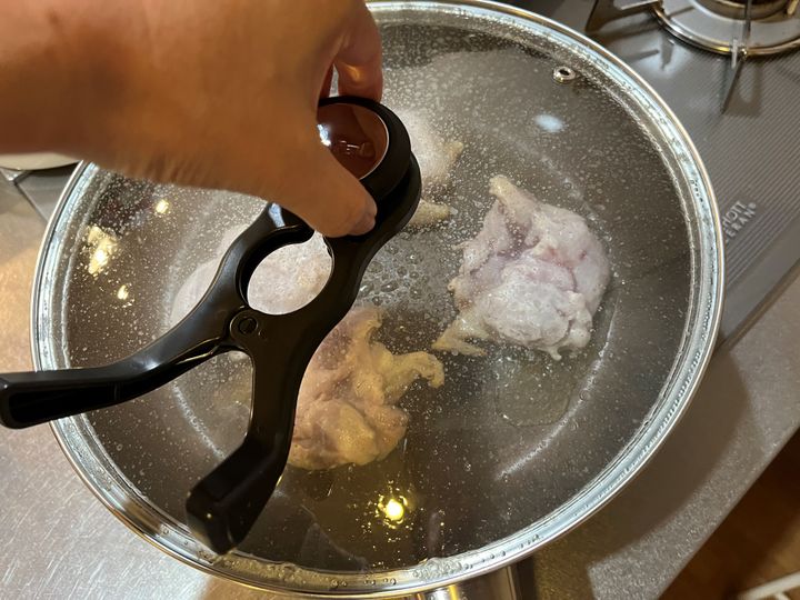 鶏肉の上下を返したら、またふたをしたい……中までしっかり、ふっくら火を通したいですからね。加熱調理中は付けっぱなしNGなので、必ず取り外します。筆者は右利きですが、握力のない左手でも付け外しはスムーズにできました。