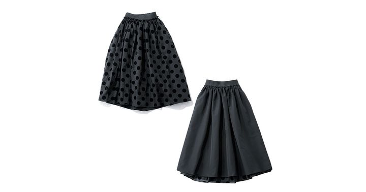 微光沢でハリ感のある生地に、同じ黒のドットシアー生地を重ねたボリュームたっぷりのドラマチックスカート。幅太ゴムウエスト。水洗い可能。