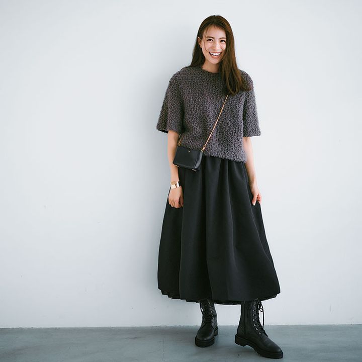 スカート¥18,700(スリースクエア)トップス¥50,600(エッフェビームス/ビームスハウス丸の内)バングル¥11,550(エイチアッシュ/フォーティーンショールーム)バッグ¥22,000(TOV/アンソロジー)ブーツ¥34,100(ダイアナ/ダイアナ銀座本店)