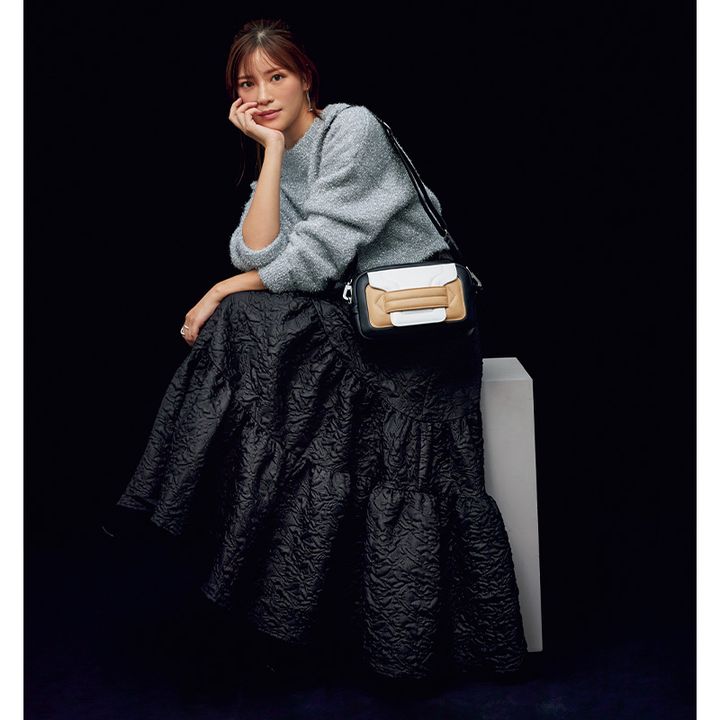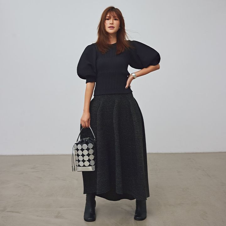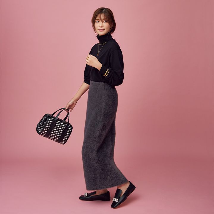 スカート¥138,600(FOXEY/FOXEY 銀座本店)ニット¥44,000(エンフォルド)ピアス¥36,630(ベン・アムン/ZUTTOHOLIC)リング¥17,820(チビ・ジュエルズ/チビジュエルズ・ジャパン)ブーツ¥99,000(ネブローニ)ミニチェーンウォレットバッグ¥71,500(J&Mデヴィッドソン/J&M デヴィッドソン カスタマーセンター)ボストンバッグ¥93,500(メゾン カナウ/ヤマニ)