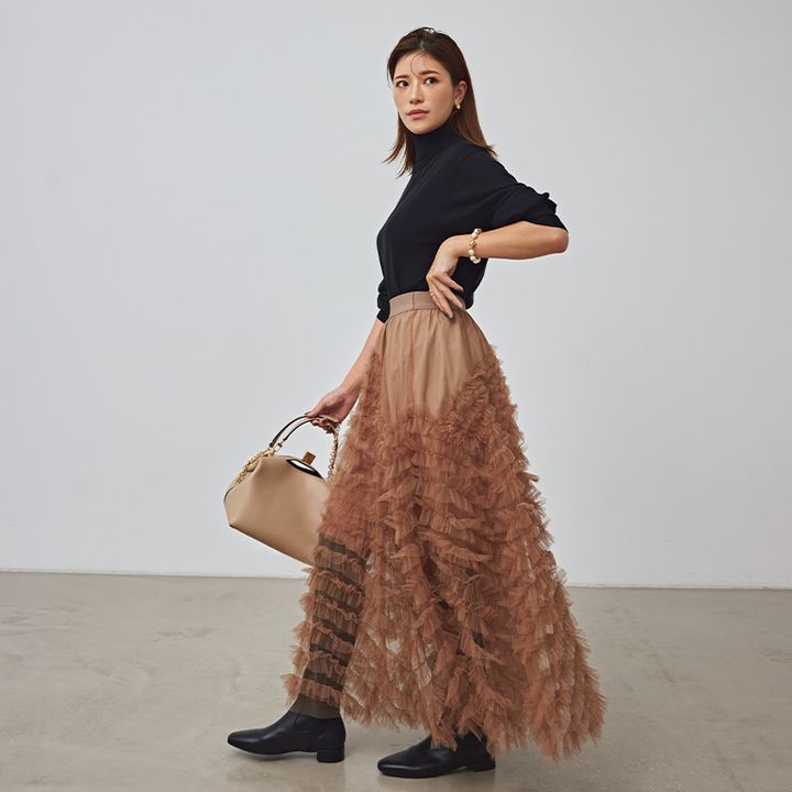 贅沢にチュールを重ねながらも、膨らみすぎないスリムフレアなシルエットが大人っぽくはけるポイント。短めの裏地で膝下が透け、フリルが軽やかに浮き出る技ありデザイン。ブーツ合わせで透け感を効果的に。