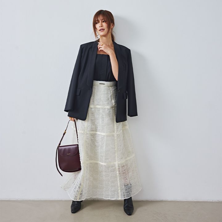 チュールスカート¥31,900(プランクプロジェクト/プランクプロジェクト 青山店)ジャケット¥58,300ビスチェ¥36,300(ともにアナイ)ネックレス¥15,400〈エムシー・スタジオ〉リング[2個セット]¥21,230〈ソコ〉(ともにZUTTOHOLIC)ピアス¥7,700(アビステ)ブーツ¥97,900(ペリーコ/アマン)バッグ¥187,000(J&M デヴィッドソン/J&M デヴィッドソン カスタマーセンター)