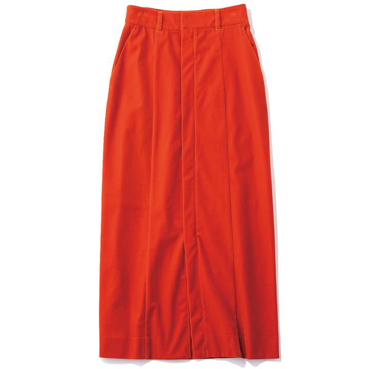 厚みのある上品なベロア生地を使用したスカートはコスパよく旬な秋色をゲットして。 レッドベロアストレートスカート¥8,800(スタイルミキサー/バロックジャパンリミテッド)