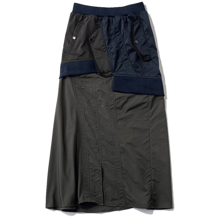 レイヤード風のデザインが個性的。ウエストはリブニットで快適に。 グレー×ネイビーミリタリースカート¥25,300(アウラアイラ/コードナイン)