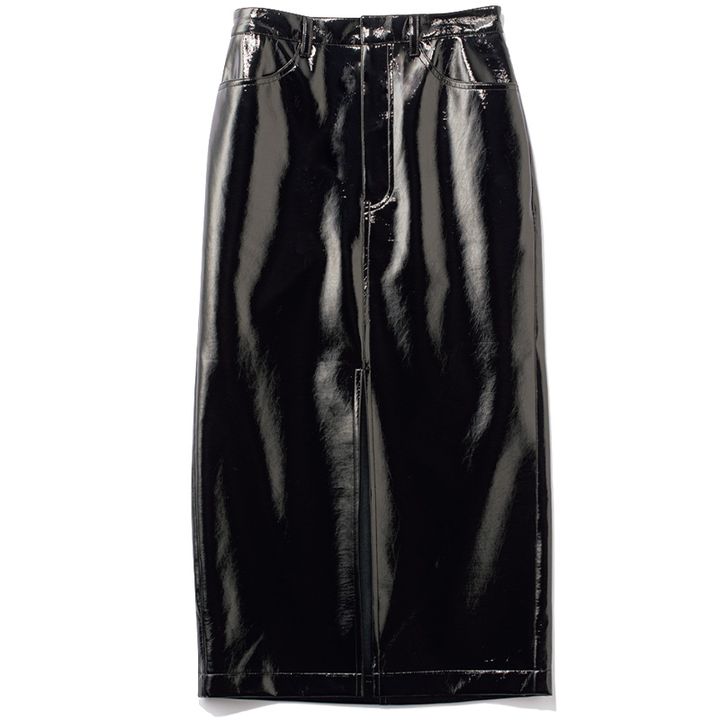 パンチの効いた光沢感と大胆なスリットデザインが、毎日のコーデの辛口スパイスに。 ブラックフェイクレザースカート¥14,300(ココ ディール)