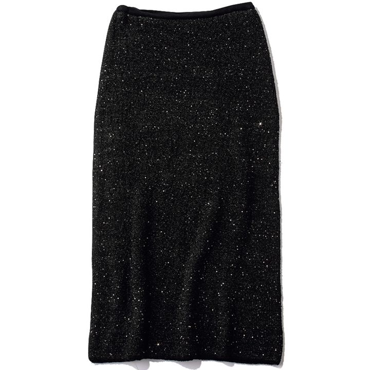 大小サイズの違う細かなラメがカジュアルに着てもどこか女っぽさある仕上がりに。伸びの良いニット素材で病みつきになる着心地のよさ。 ブラックスパンコールスカート¥19,800(ミースロエ/MIESROHE LUMINE新宿1店)