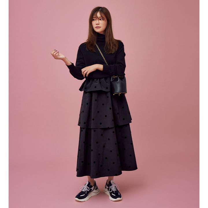 ドットスカート¥11,570(エルフランク)ニット¥31,900(スローン/ザ ショップ スローン 新静岡セノバ店)バングル¥16,500(エムシー・スタジオ/ZUTTOHOLIC)スニーカー¥39,600(デイト/ティースクエア プレスルーム)バッグ¥112,200(ザンケッティ/八木通商)