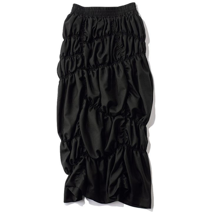 不規則に入ったシャーリングがモードでキレイめなデザインながらも、全体的に伸縮性があり、リラックス感のあるはき心地。 ブラックシャーリングスカート¥33,000(OMMO)