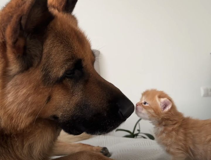 優しい眼差し♡ 小さな子猫に興味津々なジャーマンシェパードさん。