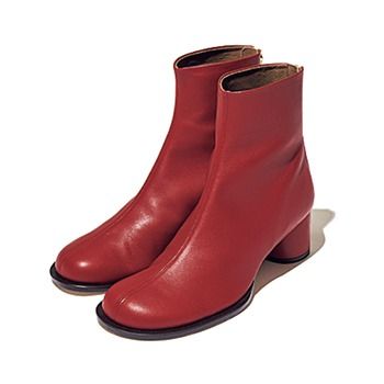 赤ショートブーツ/オデット エ オディール(オデット エ オディール 新宿店) 「細身のウールなど、キレイめのパンツに合わせても強く見えない、つま先が丸い赤ブーツは意外と使えます。赤でも落ち着いて見える、ややブラウンがかったような色味とマットな質感」(樋口さん)