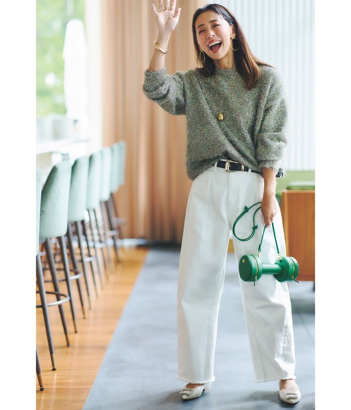 ラメニット¥37,400(アルアバイル/アルアバイル)デニムパンツ¥17,600(サロン アダム エ ロぺ)バッグ¥93,500(ロンシャン/ロンシャン・ジャパン)パンプス¥41,800〈ピッピシック〉ベルト¥28,600〈アトリエ アンボワーズ〉ピアス¥16,500(すべてフィリップ オーディベール/TOMORROWLAND)ネックレス¥42,900(ミショー/ハウス オブ ロータス)リング¥16,500(メラキ/フラッパーズ)バングル¥44,000(サスキアデイツ/ハウス オブ ロータス)