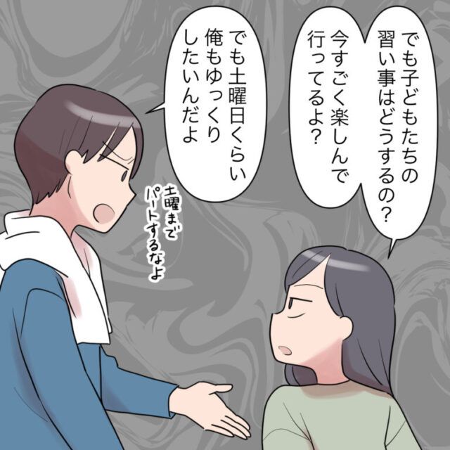 「でも子どもたちの習い事はどうするの?今すごく楽しんで行ってるよ?」とカエデさんに言われたユウタさんは、「でも土曜日くらい俺もゆっくりしたいんだよ」と自分の事しか考えていませんでした。
