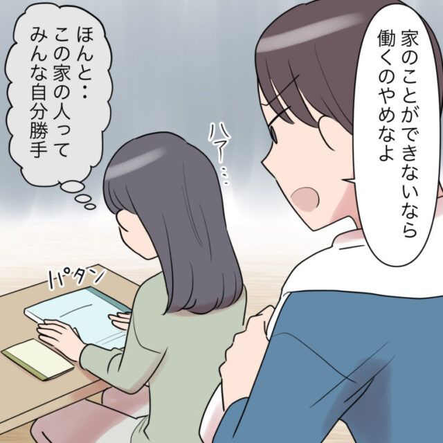 最近カエデさんが家事に手を抜きすぎだと指摘するユウタさんは、「家のことができないなら働くのやめなよ」と言いました。甘えてないで働けと言ったことはもう忘れてしまっているのでしょうか。カエデさんが、働いたらそれまでのように家事はできないと宣言した時には、「それくらいは目を瞑る」と言っていたのに。(ほんと、この家の人ってみんな自分勝手)と心の中でつぶやき、カエデさんはため息が出てしまいました。
