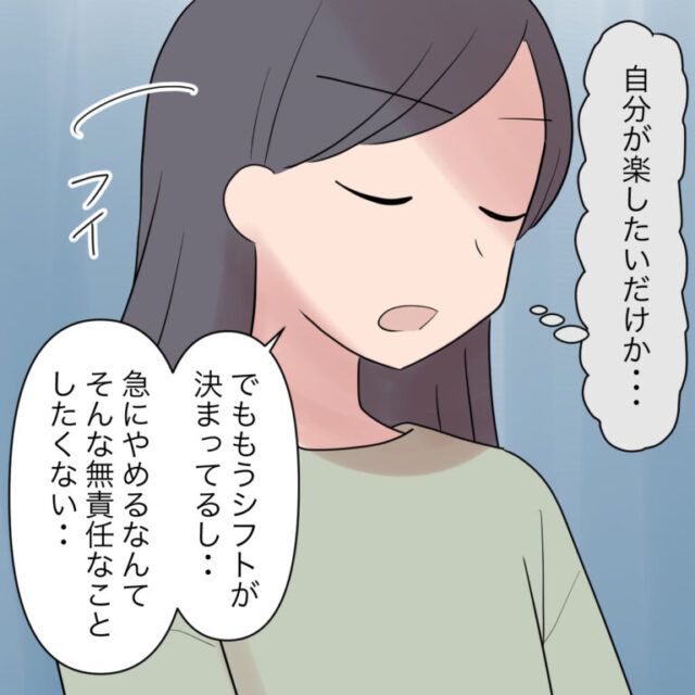 カエデさんは、自分が楽をしたいだけで発言するユウタさんに呆れつつ、「でももうシフトが決まってるし・・・急に辞めるなんてそんな無責任なことしたくない」と突き放しました。