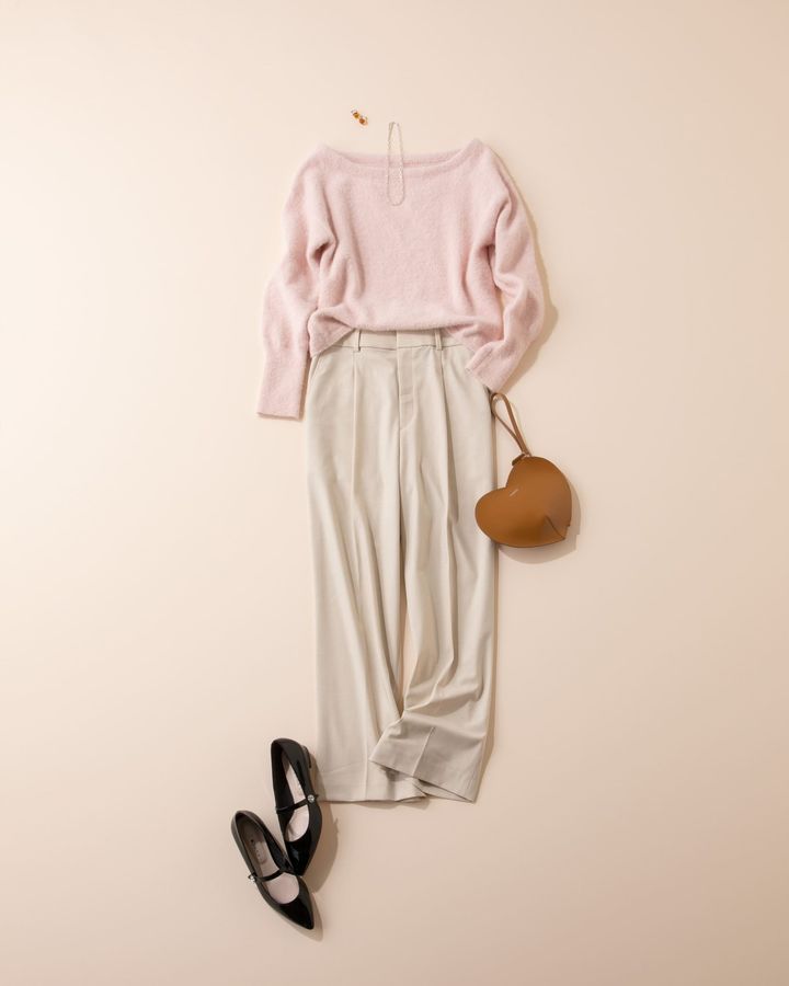 パンツ¥3,990(ユニクロ)ニット¥26,950(アンクレイヴ/アンクレイヴ<オンワード樫山>)バッグ¥12,650(ヤーキ/オデット エ オディール)シューズ¥16,500(ダイアナ)ピアス¥52,800(プラウ)ネックレス¥23,100(ココシュニック オンキッチュ/ココシュニック)
