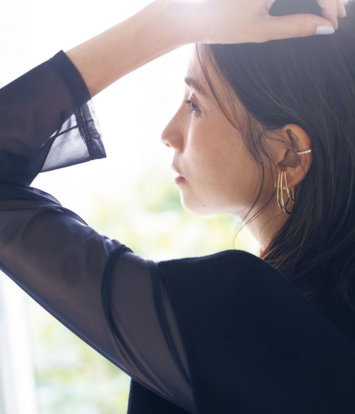 ブラウス¥9,790(カデュネ)ジレ¥58,300(スタンブリー/ヒューエルミュージアム)パンツ¥39,600(ダブルスタンダードクロージング/フィルム)バッグ¥14,960(ミラ オーウェン/ミラ オーウェン ルミネ新宿2店)パンプス¥42,900(ピッピシック/ベイジュ)イヤーカフ[下]¥35,200(リューク)イヤーカフ[上]¥121,000(プライマル)