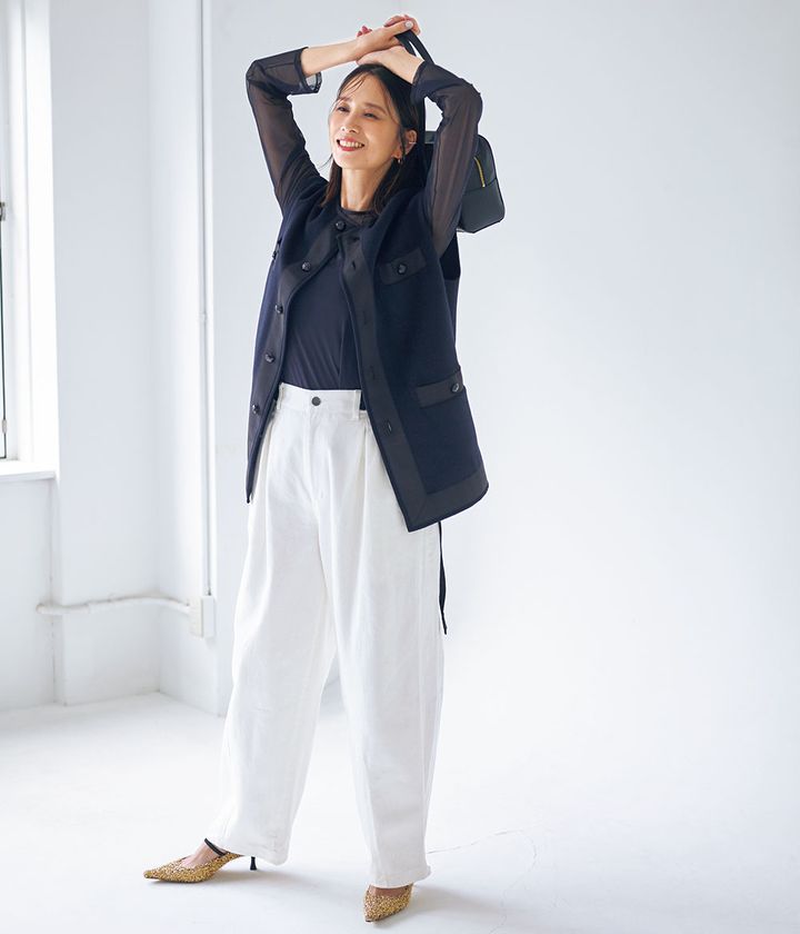 「50歳になる私が着ていいの?」と小倉さんが挑戦できずにいた透けアイテム。カジュアルの力を借りれば、あざとく見えずヘルシーに。ジャケットやジレを重ねて肌見せを調整して、品よく仕上げるのがアネフォー的セオリー。