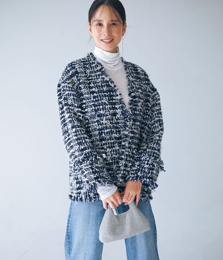 「着方が分からなかったシアートップス。きちんと感あるツイードジャケットを重ねれば、私でも大丈夫なんだ、と感動しました」