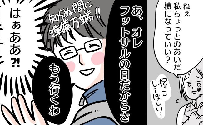 そして夜になり、夫はいそいそとフットサルの用意を始めていました。そういえばフットサルの日です。しかし長女の具合は悪く、つらそうです。私は思わず、「えっ! フットサルに行くの!?」と聞きました。すると夫は「うん、もうすぐ出るよ」と普段通り穏やかに答えた姿に、私はがく然としてしまいました。