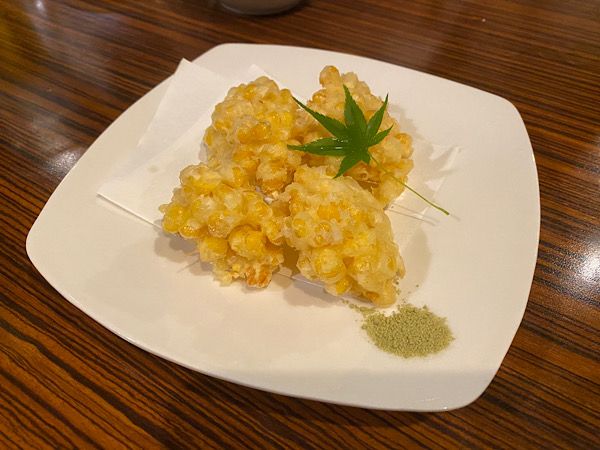 とうもろこし揚げ(お値段失念しました、すみません)。 カリッカリに揚がっているのにとうもろこしは一粒ずつジューシーなんです。抹茶塩が合います。