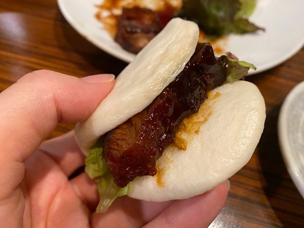 蒸しパンで包んでいただきます。 トロトロの豚の角煮にさらにタレを付けていただきます。味付けしっかりなのに濃すぎず絶品です。